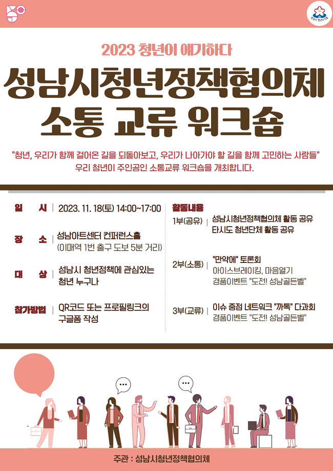 성남시는 오는 11월 18일 오후 2시~5시 성남아트센터 컨퍼런스홀에서 청년정책협의체 소통·교류 워크숍을 개최한다.