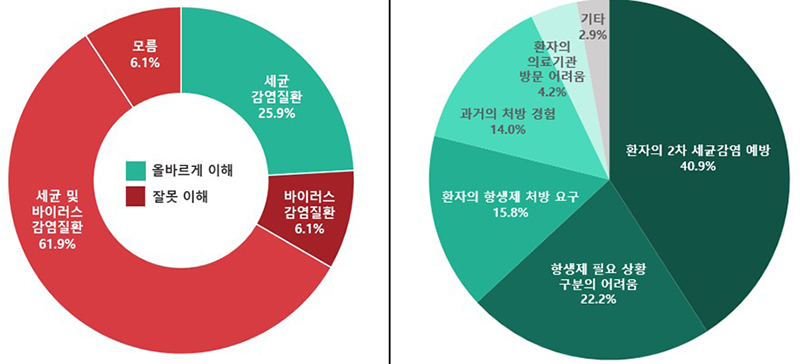 이번 조사에서 의사가 불필요한 항생제 처방을 하게 되는 경우는 ▲2차 세균감염을 예방하기 위해 처방 40.9% ▲항생제 필요상황 구분 어려움 22.2% ▲환자 요구로 처방 15.8%였다.