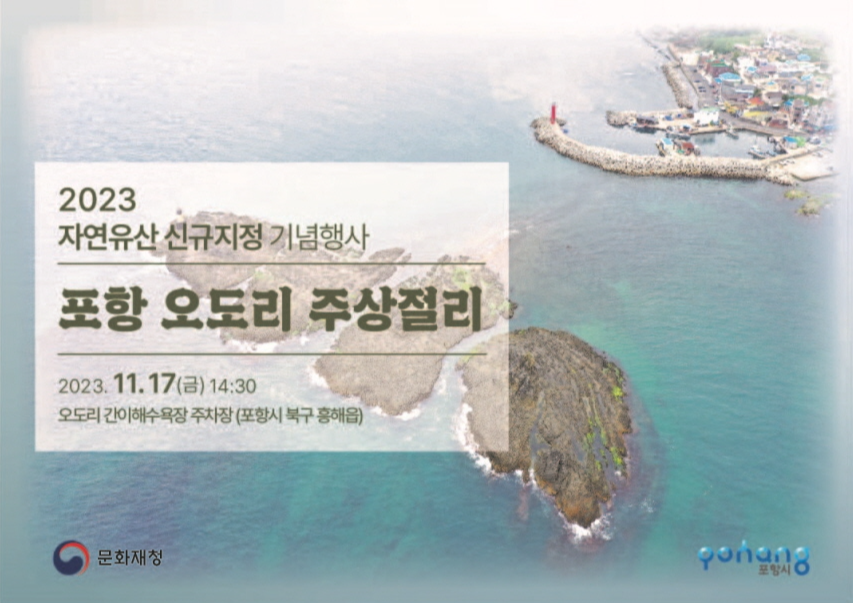 문화재청은 11월 17일 오후 2시 30분 포항 오도리해수욕장 공영주차장(포항시 북구 흥해읍)에서 「포항 오도리 주상절리」의 자연유산 지정 기념행사를 개최한다.