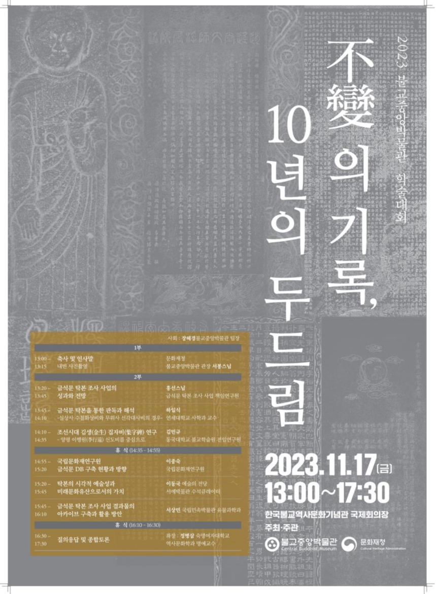 문화재청은 불교중앙박물관과 함께 11월 17일 오후 1시 한국불교역사문화기념관(서울 종로구) 국제회의장에서 금석문 탁본을 주제로 한 ‘불변(不變)의 기록, 10년의 두드림’ 학술대회를 개최한다.