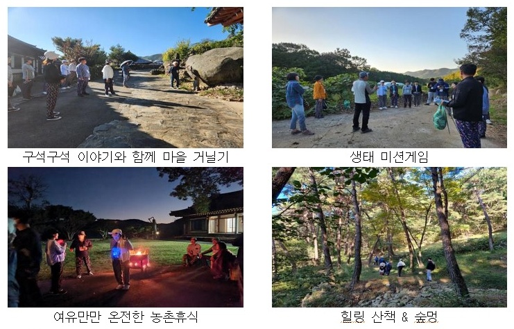 자연을 활용한 숲멍, 산책, 감 수확 등 활동과 마을 텃밭 채소로 만든 시골밥상을 경험하고, 시골 민박집에 머무르며 주민들과 교류로 농촌만의 감성을 느낄 수 있도록 했다.