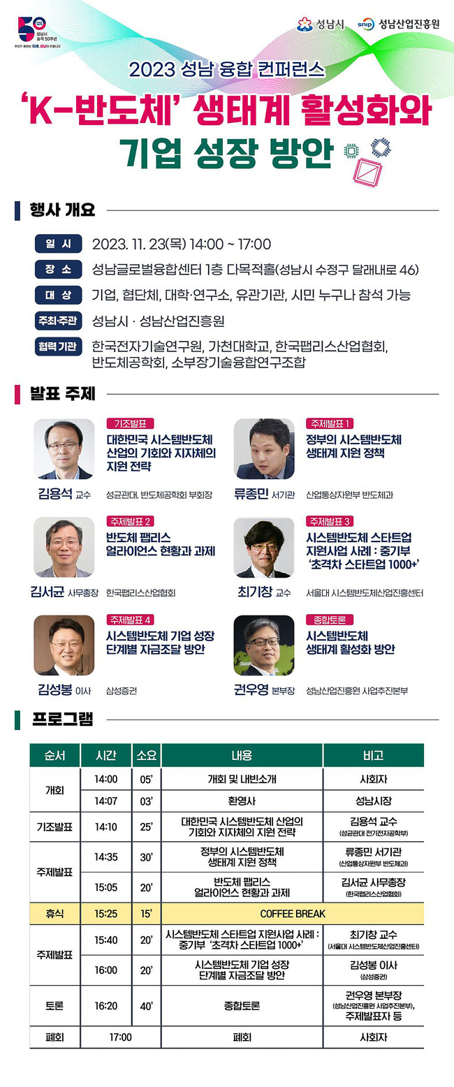 성남시 시 승격 50주년을 맞아 반도체산업 생태계 활성화와 기업 경쟁력 증진 방안을 제시하기 위해 마련된 이번 컨퍼런스는 한국전자기술연구원, 가천대학교, 한국팹리스산업협회, 반도체공학회, 소부장기술융합연구조합 등이 협력기관으로 참여한다.