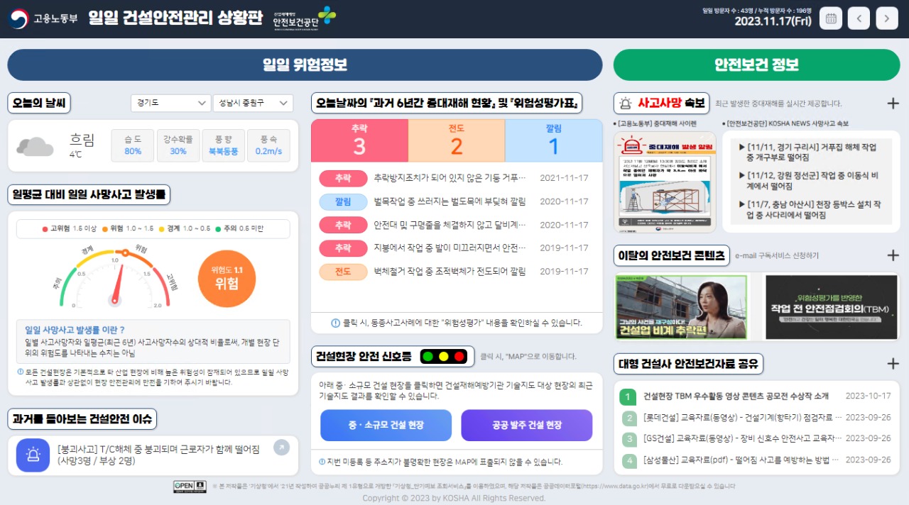 안전상황판은 건설현장에서 관심이 있는 지역별 날씨 정보, 사망사고 빅데이터와 연계한 오늘 날짜의 과거 사망사고 사례, 위험성평가표 예시 등을 제공함으로써 누구나 손쉽게 산재예방에 활용할 수 있다.