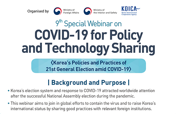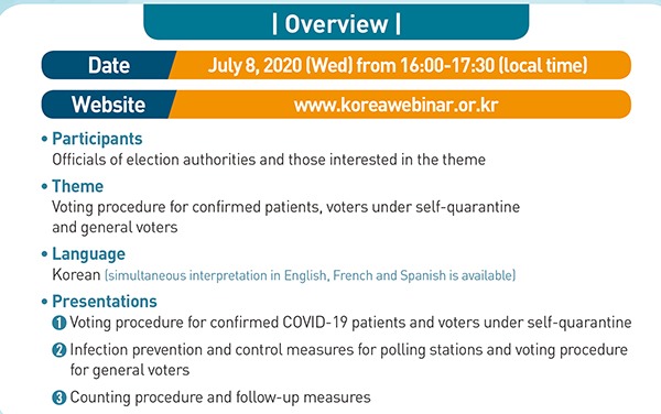 이번 웹세미나는 우리 방역 경험을 주제별로 구성하여 국제사회와 체계적으로 공유하는 ‘K-방역’시리즈의 마지막 세미나로, 행정안전부가 주관해 ‘코로나19 상황 속 선거분야의 정책 및 경험’을 주제로 진행한다.
