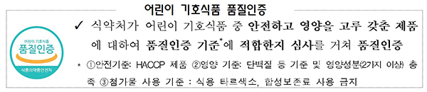 한편 식약처는 어린이들이 선호하거나 자주 먹는 식품 중 식품안전관리인증기준과 영양기준 등에 적합한 경우 품질을 인증하고 있는데, 지난 6월까지 과채주스151개, 과자14개, 발효유류 14개 등 총 246개를 인증했다.