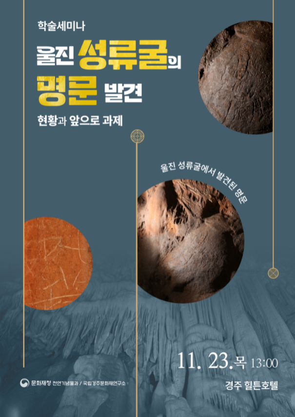문화재청은 11월 23일 오후 1시 경주 힐튼호텔에서 「울진 성류굴의 명문 발견 현황과 앞으로 과제」를 주제로 학술발표회(세미나)를 개최한다.