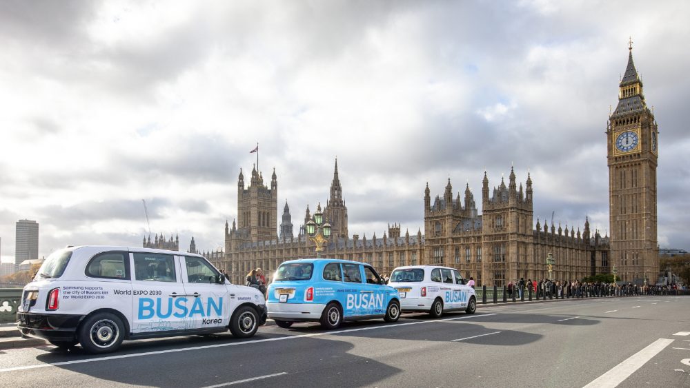 삼성전자가 영국 런던에서 ‘부산엑스포’ 택시를 통해 ‘2030 부산세계박람회(엑스포)’ 막바지 유치전을 지원한다.
