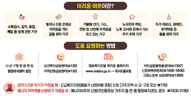 특히 이번 겨울에는 신규로 확보한 위기정보를 토대로 겨울철에 어려움이 큰 생활요금 체납 가구와 독거어르신, 장애인 등 취약가구 약 8만 명을 집중 점검할 계획이다.
