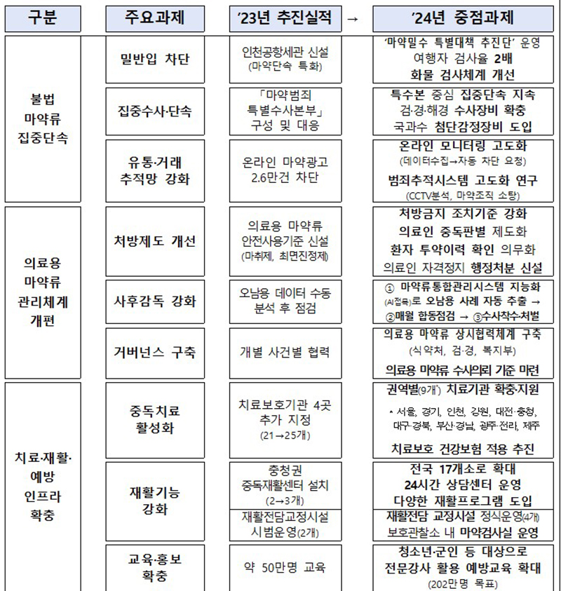 이번 대책은 ▲불법 마약류 집중·단속 ▲의료용 마약류 관리체계 개편 ▲치료·재활·예방 인프라 확충 등 3대 분야와 9개 추진과제로 구성했다.