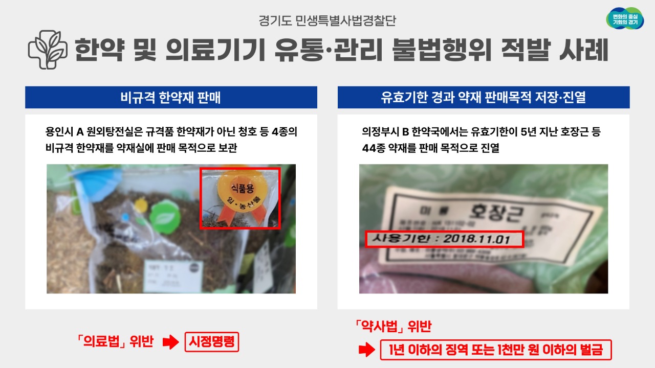 유효기한이 경과한 한약재를 보관한 한약취급업소와 허가받은 의료기기의 사용 목적과 다른 효능‧효과가 있다고 거짓 광고한 의료기기 판매업소들이 경기도 민생특별사법경찰단에 대거 적발됐다.