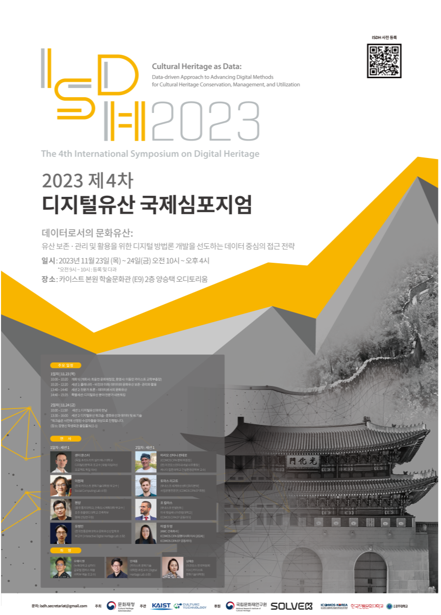문화재청은 한국과학기술원, 이코모스 한국위원회와 함께 11월 23일부터 24일까지 한국과학기술원(이하 ‘카이스트’) 학술정보관(대전 유성구)에서 ‘데이터로서의 유산: 보존관리 및 활용을 위한 데이터 중심의 전략(Data-driven heritage conservation, management and utilization)’을 주제로 국내외 전문가 8개국 20명이 참여하는 「2023 디지털 유산 국제 학술대회」를 개최한다.