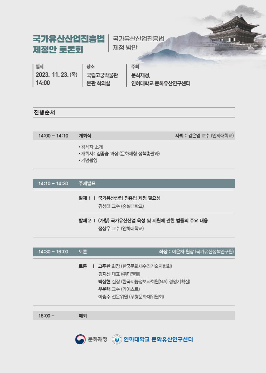 문화재청은 11월 23일 오후 2시 국립고궁박물관(서울 종로구)에서 「국가유산산업 진흥법(가칭)」 제정안 검토를 위한 토론회를 개최한다.