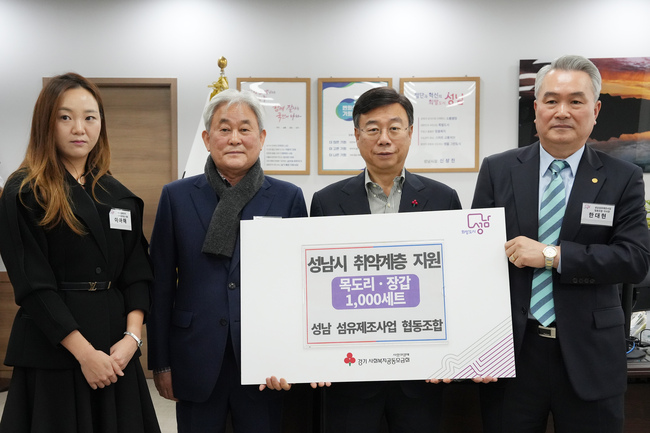 시는 이날 오전 시청에서 신상진 성남시장과 한대현 성남섬유제조사업 협동조합 이사장, 홍기섭 홍한섬유산업 대표, 이아해 더엠에이치 인터내셔널 대표 등이 참석한 가운데 어르신 방한용품 전달식을 가졌다.