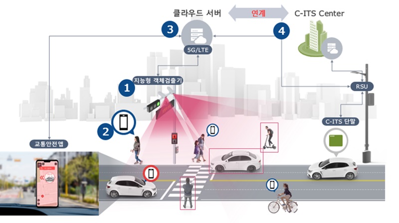 어린이 보호구역 C-ITS 안전 특화 서비스는 CCTV, 라이더(Lidar), 초광대역(UWB) 등 검지장치를 활용해 차량과 보행자의 정확한 위치정보를 파악하고 이를 별도 단말기 또는 스마트폰 앱을 통해 운전자에게 충돌 위험을 미리 경고해 주는 정보를 제공하는 기술이다.
