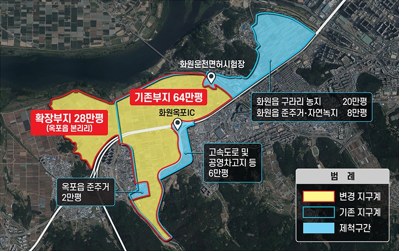 보상비가 높은 화원 구라리 등 1,185천㎡(약 36만 평) 제외하고, 옥포 본리리 농지 922천㎡(약 28만 평) 추가 편입