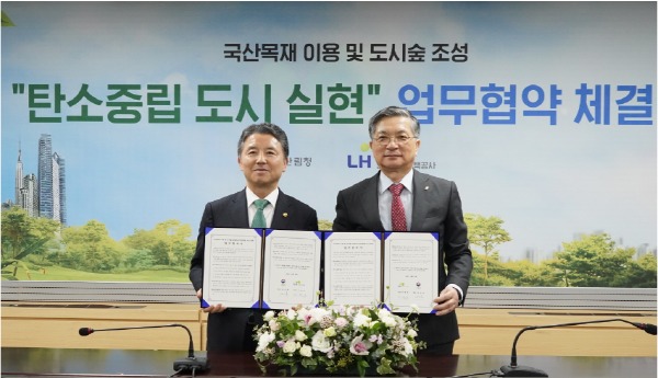 산림청과 한국토지주택공사는 23일 한국토지주택공사(LH) 서울지역본부에서 목재 이용 및 도시숲 조성을 통해 생활 속 탄소중립도시를 실현하기 위한 업무협약(MOU)을 체결하였다.