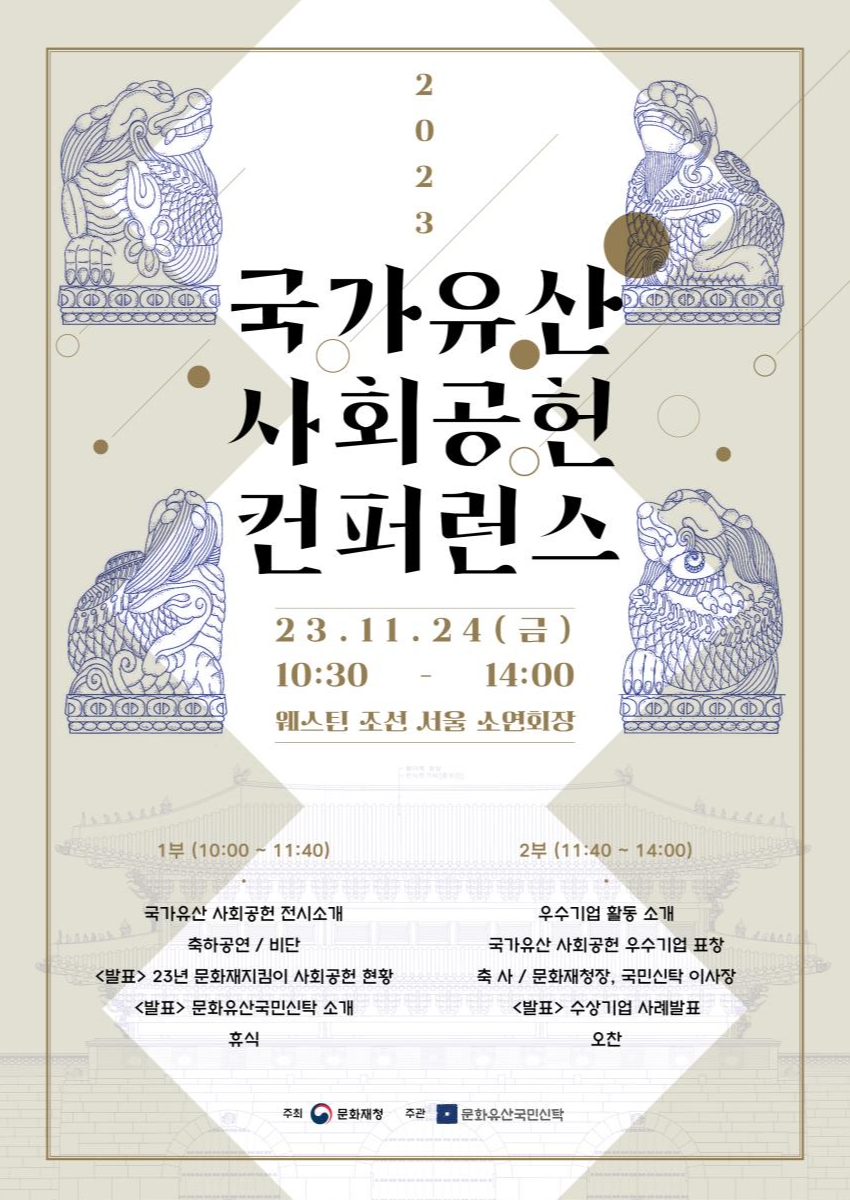 문화재청은 문화유산국민신탁과 함께 11월 24일(금) 오전 10시 30분 웨스틴 조선 서울(서울 중구)에서 「2023 국가유산 사회공헌 학술대회(컨퍼런스)」를 개최한다.