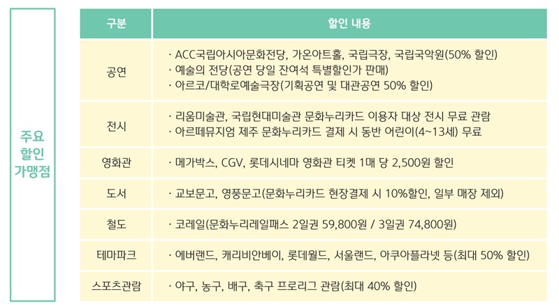 문화누리카드 이용자들을 위한 혜택도 적지 않다. 문화누리 카드로 ACC 국립아시아문화전당이나 국립극장에서 공연을 관람할 때 관람료의 50%를 할인 받을 수 있다.