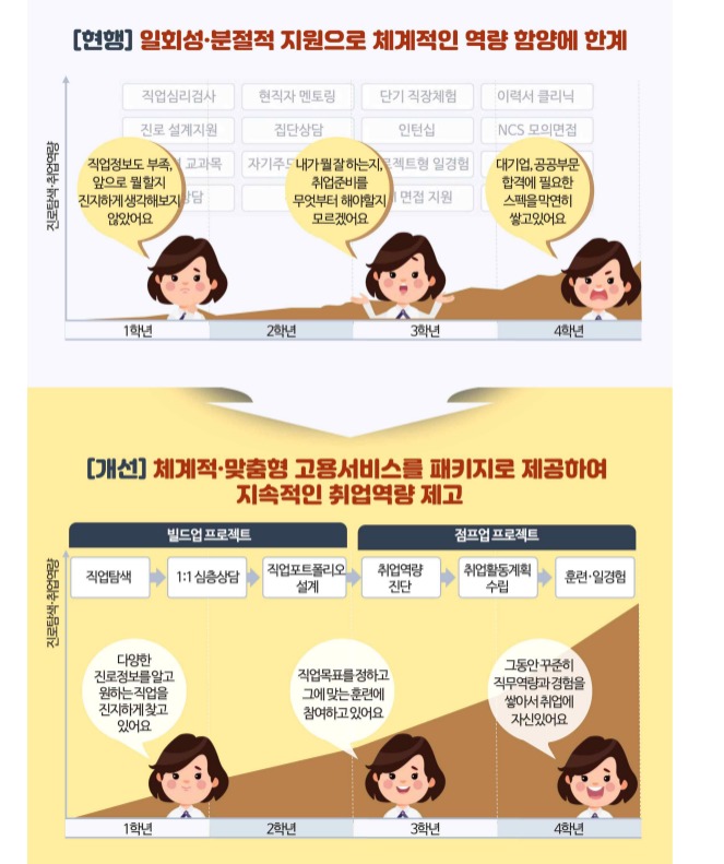 한편, 재학생 맞춤형 고용서비스는 올해 12개 대학의 시범사업을 시작으로 2024년에는 50개 대학으로 확대하여 운영될 예정이다. 또한 2024년 시범사업으로 직업계고 학생을 위한 ‘고교 재학생 맞춤형 고용서비스’도 제공할 예정이다.