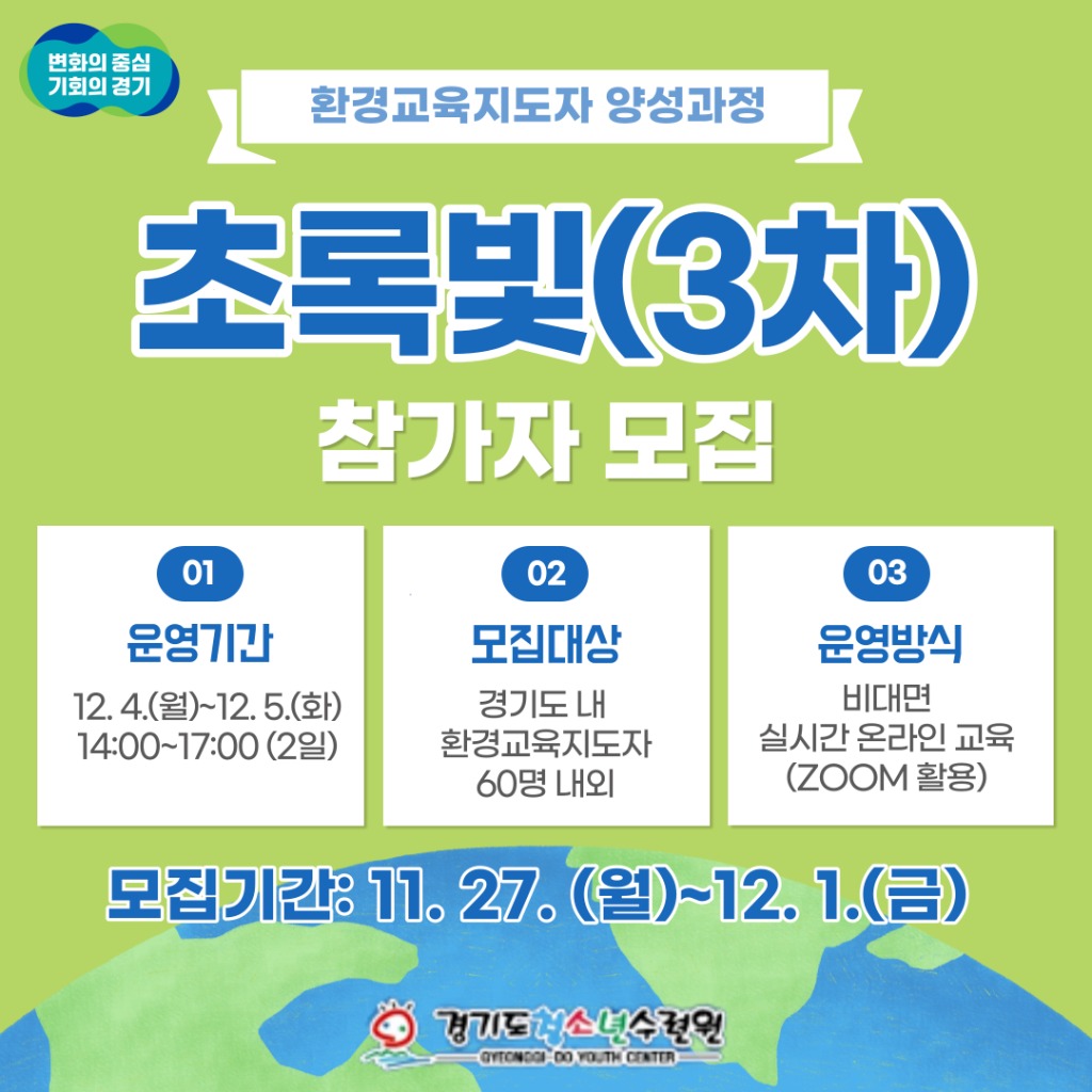 경기도청소년수련원이 12월 4일부터 5일까지 이틀간 비대면 교육으로 진행하는 2023 환경교육지도자 양성과정 ‘초록빛(3차)’ 참가자를 모집한다.