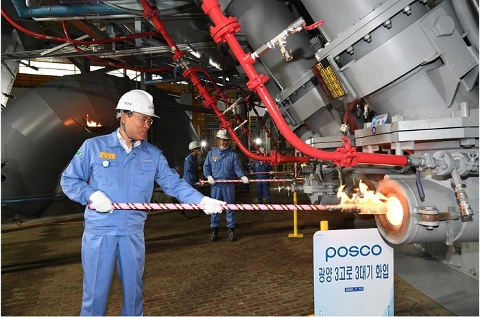 포스코(회장 최정우)는 10일 오전 광양제철소 3고로 현장에서 그룹사 임직원들이 참석한 가운데 2차 개수를 마치고 3대기 조업을 시작하는 고로 화입식을 진행했다.