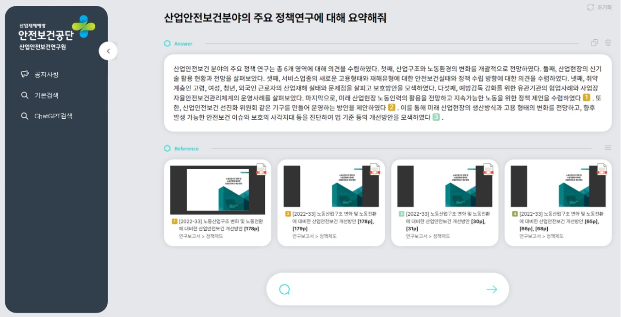예를 들어 입력창에 “산업안전보건분야의 주요 정책연구에 대해 요약해줘”라고 입력하면, 연구원이 보유한 연구자료를 찾아서 자동으로 요약·출력하는 방식이다. 연구원은 이와 같은 대화형 서비스의 완성도를 높이기 위해 지난 1989년도부터 현재까지 만들어진 총 3,614건의 자료*를 인공지능(AI)에 학습시켰다.