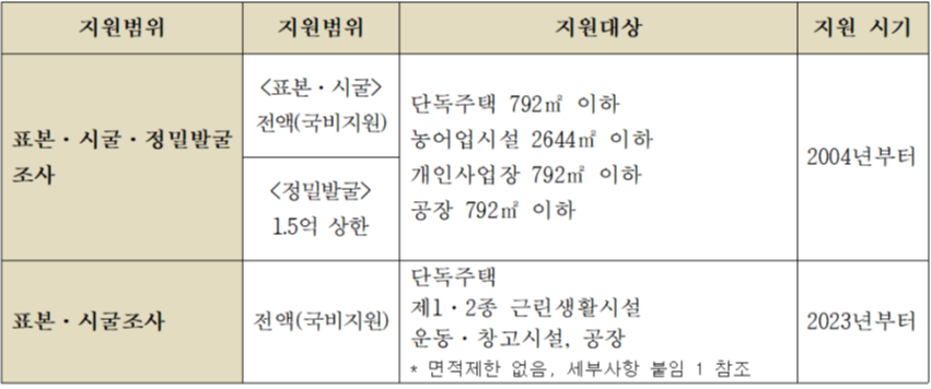 문화재청은 일정 규모 이하의 건설공사 시 매장유산 조사를 국가가 지원하여 경제적 부담을 줄이고 매장유산을 효과적으로 보호·관리하기 위해 ‘국비지원 발굴조사 사업’을 시행해오고 있으며, 단독주택, 농어업시설 등 소규모 건설공사에 한해 발굴조사 비용을 지원하던 것을 확대시켜 올해부터는 제1·2종 근린생활시설과 운동시설 같은 생활밀접형 건설공사에 대해서는 면적에 상관없이 진단조사(표본·시굴) 비용을 전액지원해오고 있다.