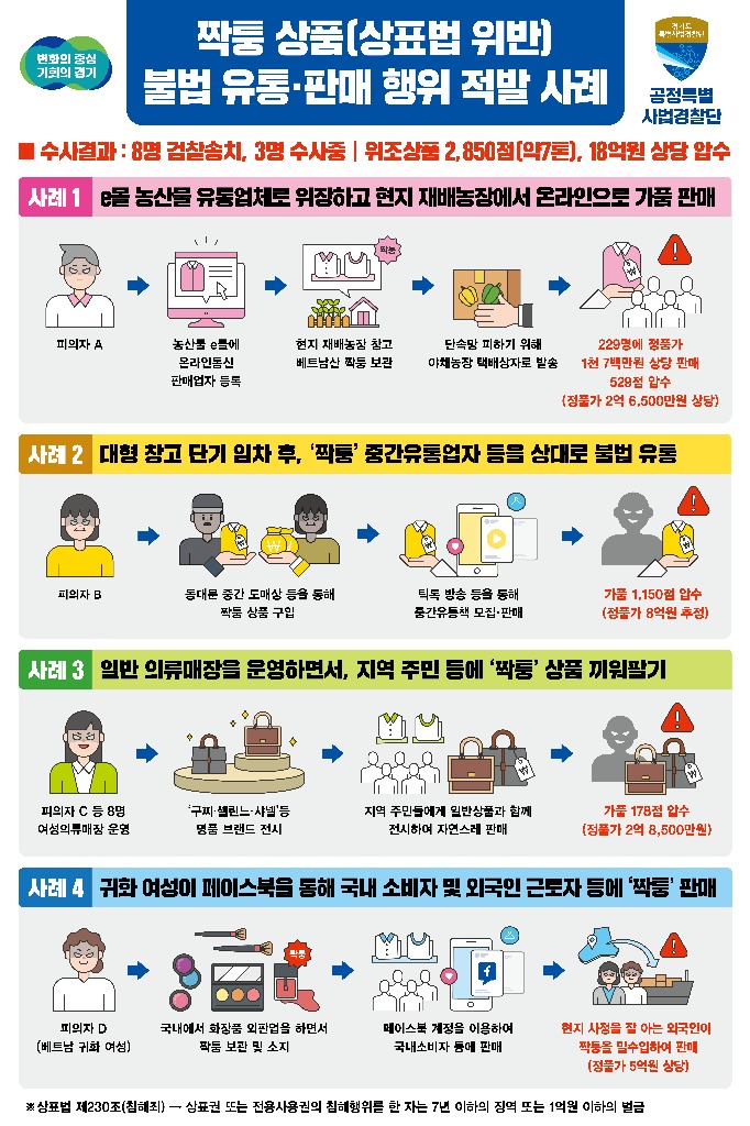누리소통망(SNS) 틱톡(TikTok)에서 가짜 명품(짝퉁) 판매꾼으로 활동하거나, 대형 상가건물을 통째로 임차해 수억대 가짜 명품을 유통‧보관하는 등 상표법을 위반한 11명이 경기도 공정특별사법경찰단에 검거됐다.