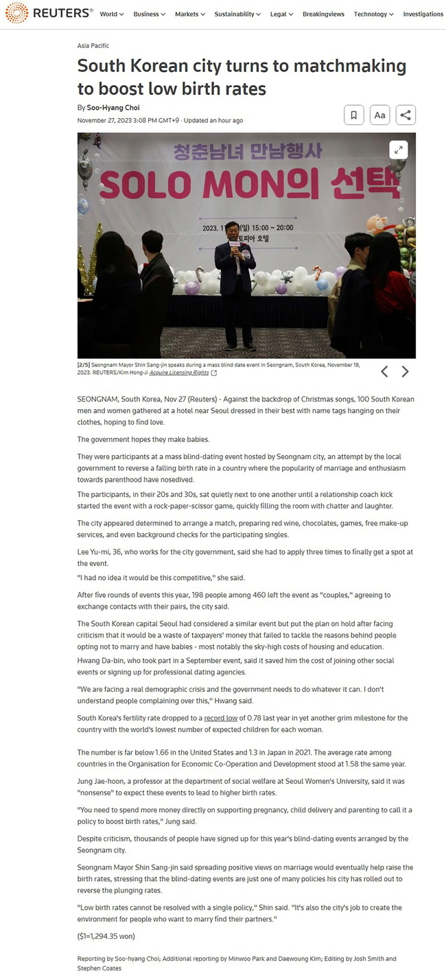 성남시의 미혼 청춘남녀 만남 행사인 ‘ 솔로몬 (SOLO MON) 의 선택 ’ 이 27 일 세계적 통신사인 로이터 (Reuters) 에서도 보도됐다 . 지난 8 월 뉴욕타임스 (NYT) 1 면에 기획 기사가 실린 이후 또다시 글로벌 뉴스망을 탔다.