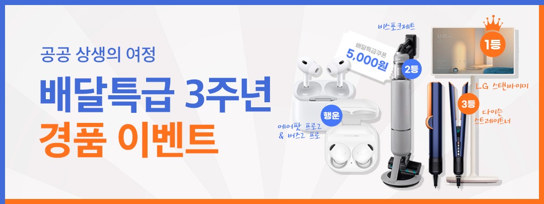 기한 내 이벤트에 참여한 소비자 중 1등에게는 ‘LG스탠바이미’를 증정한다. 2등 2명에는 ‘비스포크제트 청소기’, 3등 3명에는 ‘다이슨스트레이트너’가 마련됐다. 행운상 경품으로는 ‘에어팟 프로2’와 ‘갤럭시 버즈프로’가 각각 5개씩 마련됐다. 이밖에 아쉽게 경품을 놓친 소비자 중 2천 명을 추첨해 배달특급 5천원 할인쿠폰을 제공할 계획이다.