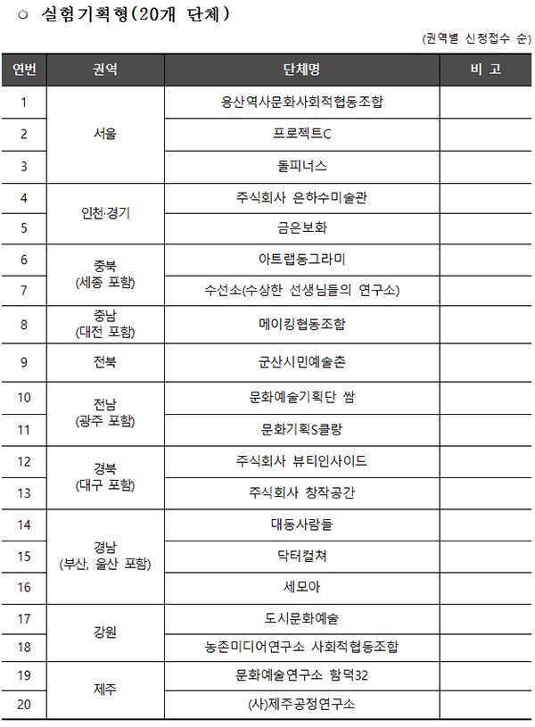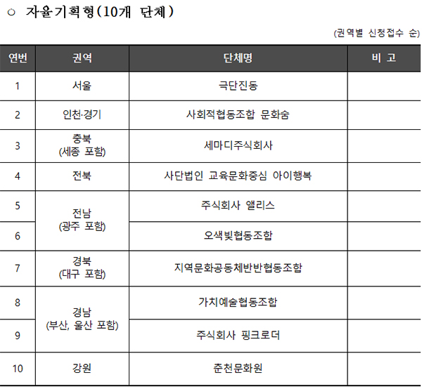 전국 10개 권역별 자율기획형 1개 단체, 실험기획형 2개 단체씩