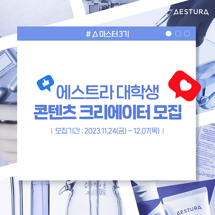 아모레퍼시픽의 더마 코스메틱 브랜드 에스트라(AESTURA)가 지난 24일부터 ‘A마스터’ 3기 모집을 시작했다. A마스터는 에스트라(AESTURA)와 마스터(MASTER)의 합성어로 국내 대표 더마 브랜드 에스트라의 대학생 콘텐츠 크리에이터를 뜻한다.