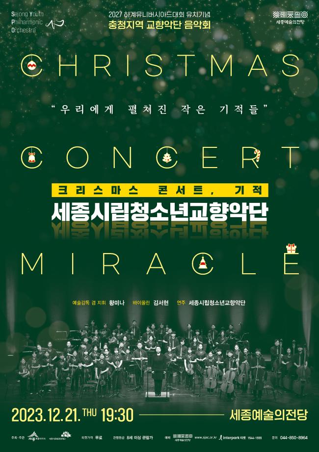 세종시립청소년교향악단이 오는 12월 21일 오후 7시 30분 세종예술의전당에서 제2회 정기연주회 ‘크리스마스 콘서트, 기적’을 개최하기로 하고 시민 참여를 기다린다.