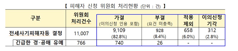 그간 위원회에서 최종의결한 전세사기피해자등 가결 건은 총 9109건(누계)이며, 긴급 경·공매 유예 협조요청 가결 건은 총 740건(누계)이다.