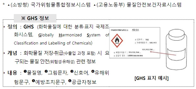 소방청과 고용노동부는 양 기관에서 개별적으로 운영 중인 ‘화학물질 정보제공 시스템’의 중복된 화학물질 4,041종 중 GHS 정보가 다른 393종에 대한 정보 통일화 작업을 완료했다고 밝혔다.