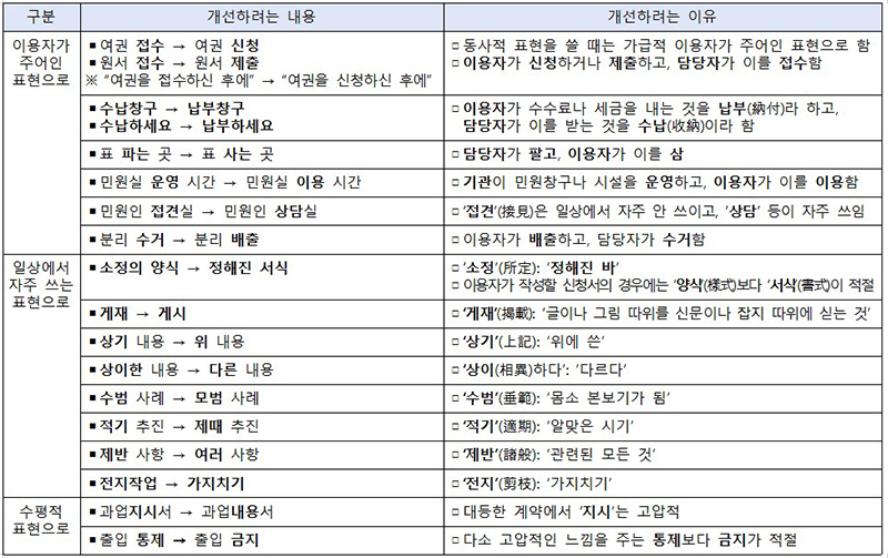 이번 개선사항은 국민이 편하게 이해할 수 있도록 주어를 이용자 시점으로 표현하고, 잘 쓰지 않는 한문 용어 등을 일상에서 쓰는 표현으로 고치는 데 주안점을 두었다.