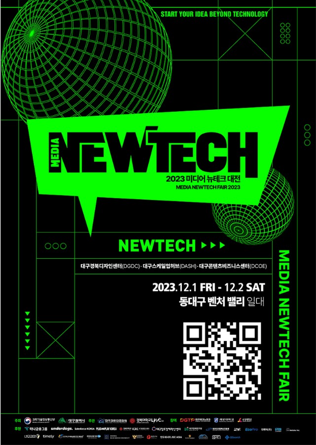 대구광역시와 과기부가 공동 주최하는「2023 미디어 뉴테크 대전」이 12월 1일(금)부터 12월 2일(토)까지 양일간 대구경북디자인센터 등 동대구벤처밸리 일대에서 개최된다.