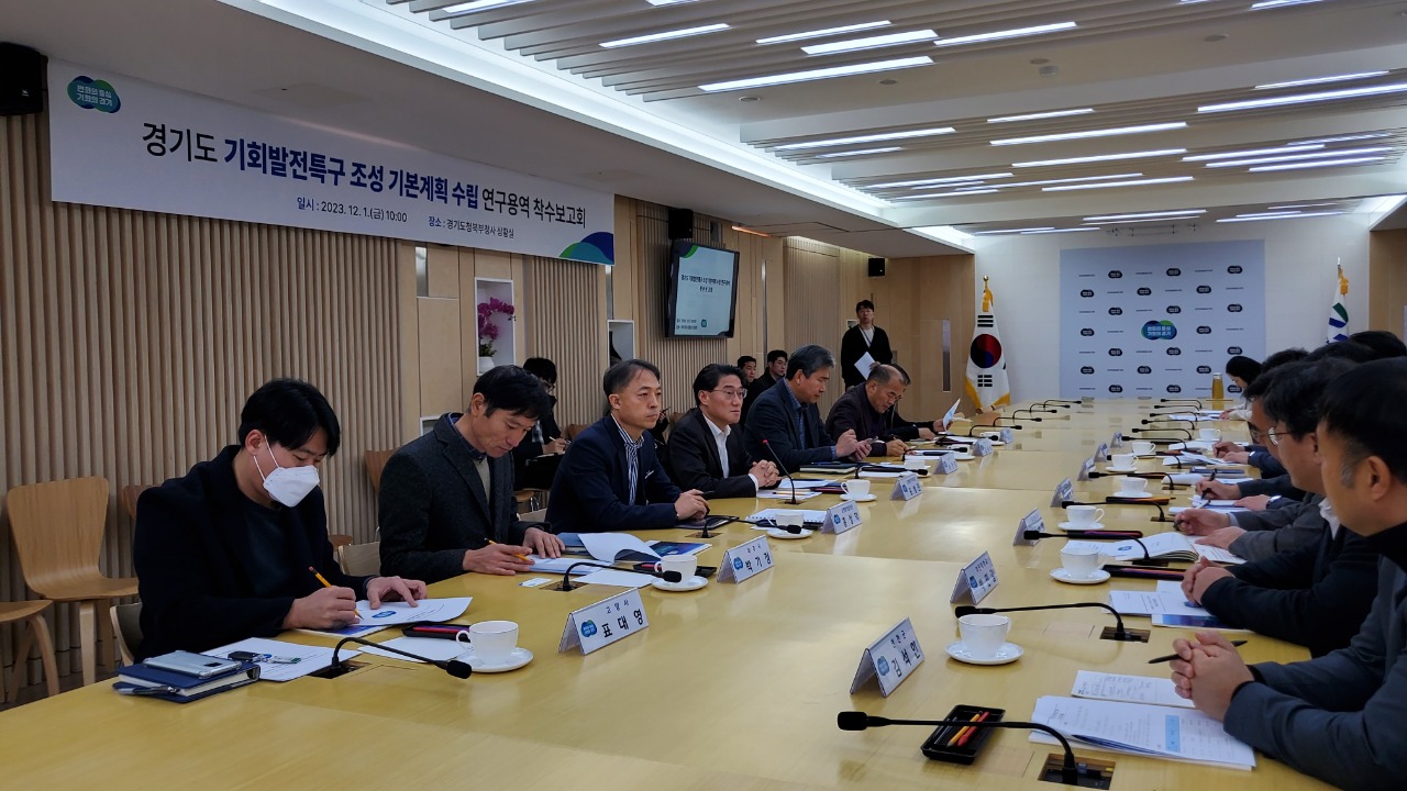 도는 1일 경기도청 북부청사 상황실에서 특구 대상 지역인 고양, 파주, 김포, 양주, 포천, 동두천, 가평, 연천 등 8개 시군과 경기연구원 등 관계자 약 15명이 참석한 가운데 경기도 기회발전특구 조성 기본계획 수립을 위한 연구용역 착수 보고회를 진행했다.