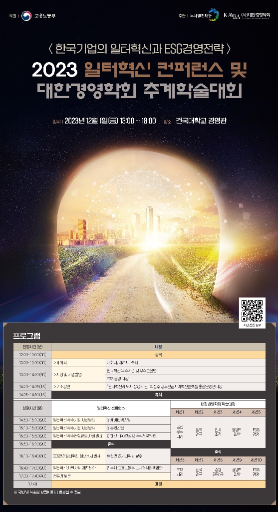 고용노동부와 노사발전재단은 12.1.(금) 13시 건국대학교 경영관에서 「2023년 일터혁신 컨퍼런스」를 개최했다.