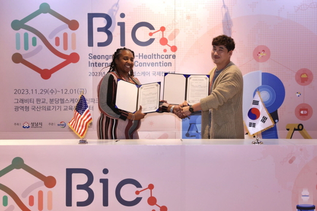 성남시는 12 월 1 일 막을 내린 ‘2023 성남 바이오헬스케어 국제 컨벤션 ’ 에서 현장 계약과 업무협약 (MOU) 체결 등 390 만 달러 ( 약 50 억 원 ) 에 이르는 수출계약을 달성했다.