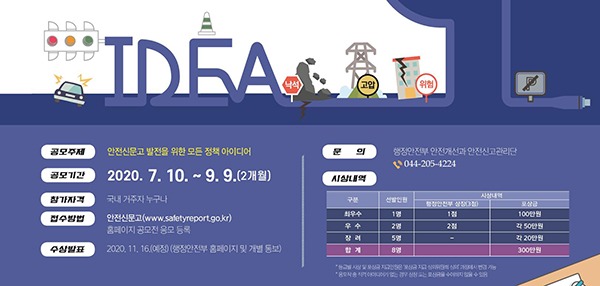 이번 공모전은 안전신문고 활성화를 위한 신규 정책개발 및 효과적 대국민 홍보 방안과 안전신문고를 활용한 효과적인 사고예방 및 대응 방안 등이다.