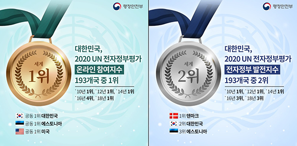 우리나라가 2020년도 UN 전자정부평가에서 193개 회원국 중 전자정부발전지수 2위(1위 덴마크), 온라인참여지수 공동 1위(한국, 미국, 에스토니아)를 기록했다.