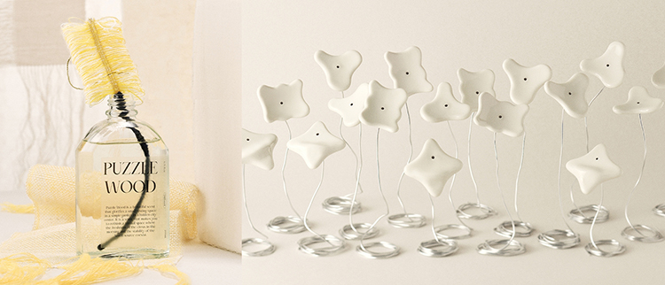 퍼즐우드의 아트 오브제 ‘몽상 식물 에디션’은 파이브콤마와 협업한 핸드메이드 텍스타일 오브제 Scent Wick라인과 신진 작가와 협업한 핸드메이드 세라믹 오브제 Shape of Ritual라인으로 구성했다.