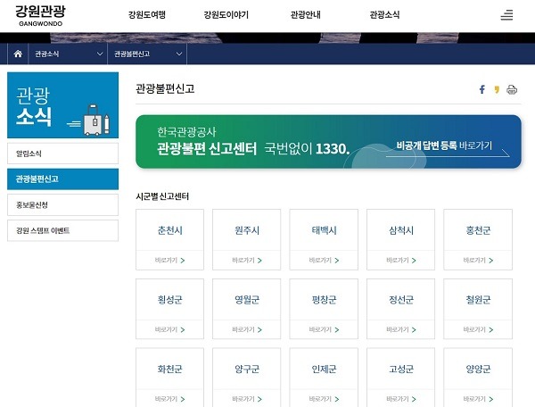 관광지에서 불법 행위 등 불편 사항을 겪거나 관광안내, 통역이 필요한 경우에는 한국관광공사에서 운영하는 ‘1330 관광불편신고센터’에 도움을 요청하거나 불편사항을 24시간 신고할 수 있다. 지자체별 신고 창구에서도 불편 사항을 접수하고 있다.