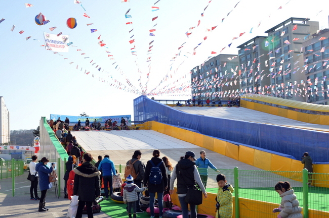 눈썰매장은 성남종합운동장 야외주차장에 각각 8 레인의 일반용 슬로프 ( 폭 13 m , 길이 45 m ) 와 유아용 슬로프 ( 폭 13 m , 길이 30 m ) 를 조성했다 .
