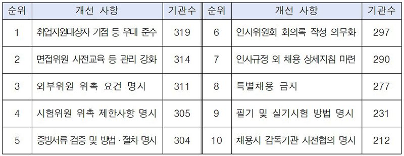 이 가운데 공직유관단체에 대한 개선 권고가 빈발한 항목은 ▲국가유공자법에 따른 취업지원 대상자 가점 및 동점자 우대 준수(319개) ▲차별 소지가 있는 질문 금지 등 면접위원 사전교육 관리 강화(314개) ▲퇴직 후 3년이 경과하지 않은 자 위촉 금지 등 외부위원 위촉 요건 명시(311개) 등이 가장 많았다.