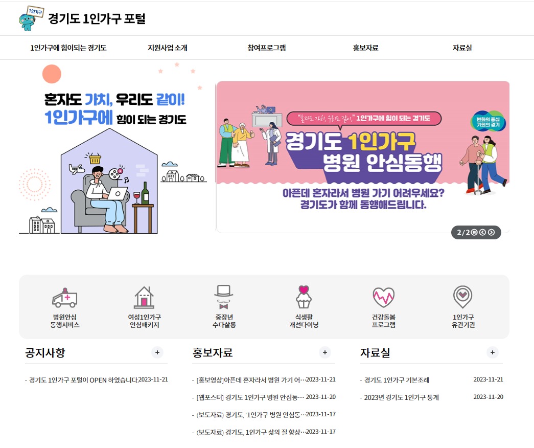 여기서 지역별, 분야별, 연령별 참여 프로그램을 찾아서 신청할 수 있고, ▲경기도 1인가구 시행계획 ▲1인가구 병원 안심동행 ▲여성1인가구 안심패키지 ▲1인가구 통계 ▲유관기관 등 다양한 정보를 열람할 수 있다.