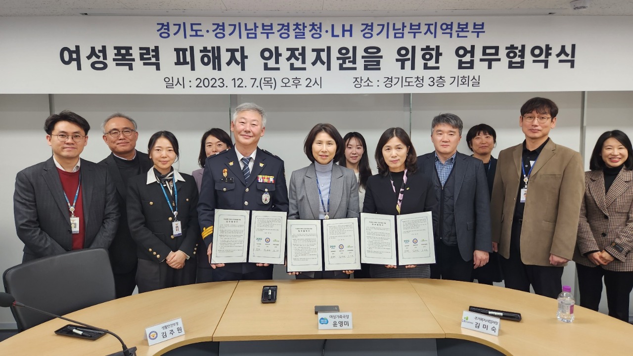 경기도는 7일 경기도청에서 윤영미 경기도 여성가족국장, 김주원 경기남부경찰청 생활안전부장, 김미숙 LH 경기남부지역본부 주거복지사업처장 등이 참석한 가운데 ‘여성폭력 피해자 안전지원을 위한 업무협약’을 체결했다.