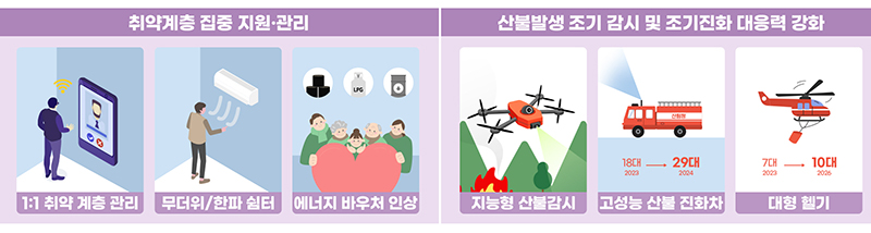 폭염·한파, 대설, 가뭄, 산불 등 다양한 기후위기에 대비해 폭염·한파 취약계층 지원을 강화하고, 대설에 대비해 현장 중심의 제설 대책을 추진한다.