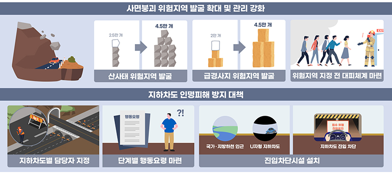 산사태 취약지역은 2만 5000곳에서 4만 5000곳, 급경사지는 2만 곳에서 4만 5000곳 등 확대 발굴하고 위험지역으로 지정하기 전이라도 인명피해 우려지역으로 지정해 주민대피체계를 마련한다.